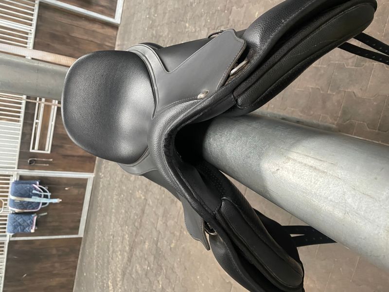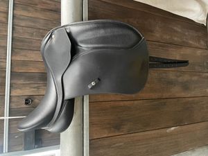 16inch Wintec black pony dressage saddle. In excellent condition. Lightweight and durable. Saddle comes with Wintec cover, wintec stirrup leathers and knife edge stirrups.