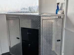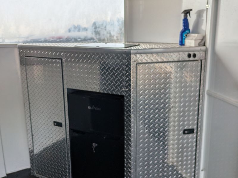 _ Kitchenette with sink, fridge, microwave, and some storage.