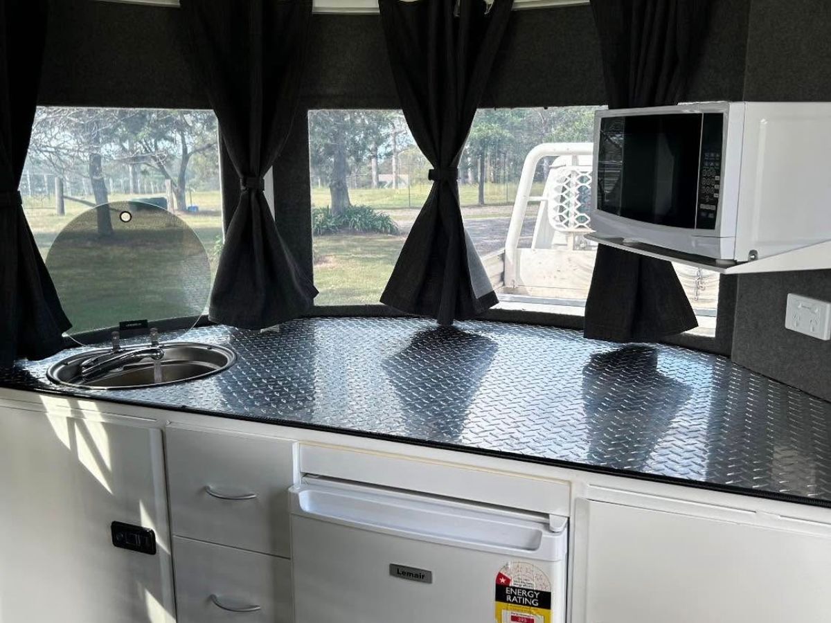 Front kitchenette with fridge, microwave, sink and plenty of storage