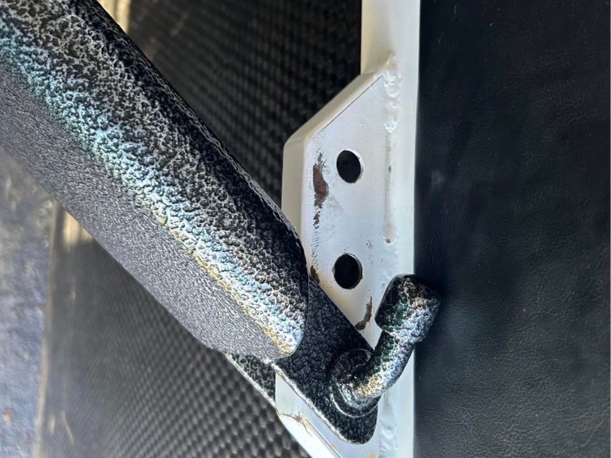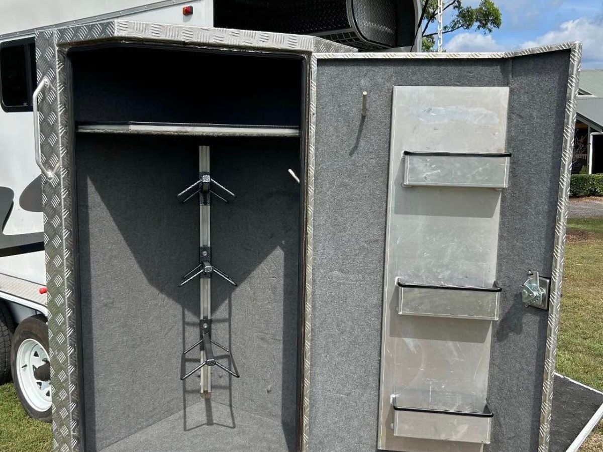 Swing out, lockable tack box with 3 saddle racks