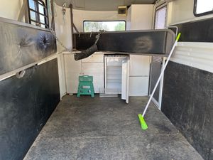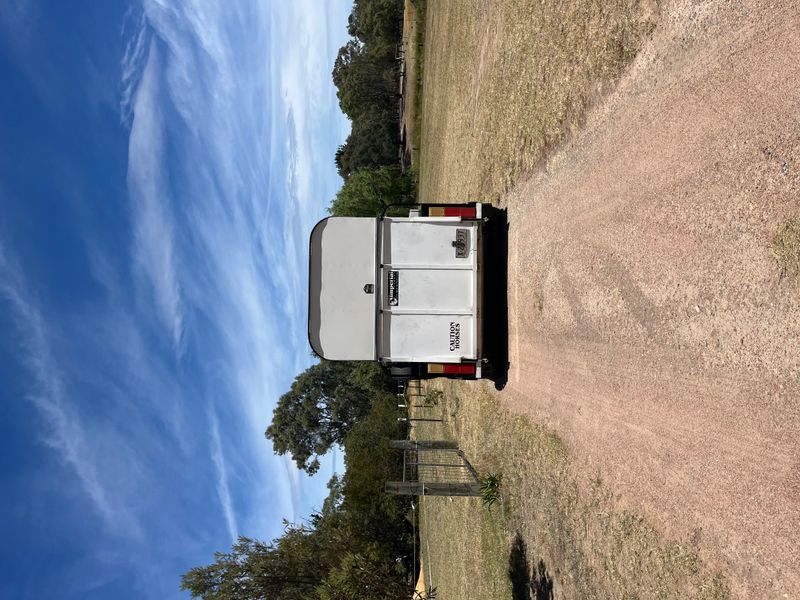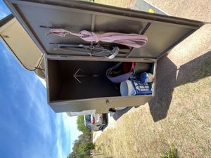 Fridge, slide out metal food storage cupboards, hanging garment cupboard, hook up to electricity - outlets for camping plus internal and external lights.