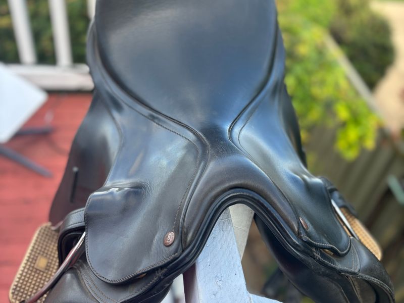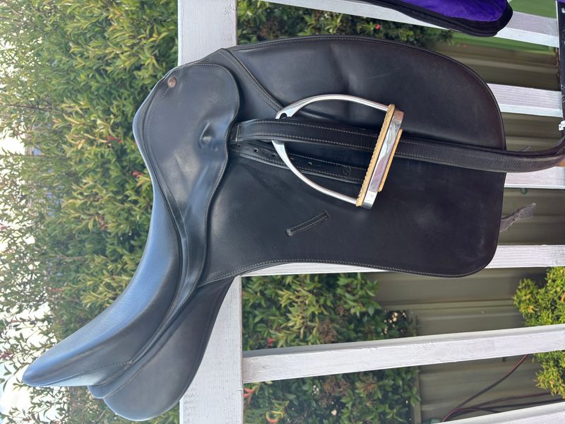 Bates Caprilli dressage saddle 17.5” with Care, fully mounted. Changable gullet, currently black (medium). Y shaped girthing system. Great condition. Well looked after, regularly cleaned and always kept inside. A really nice saddle to ride in.
