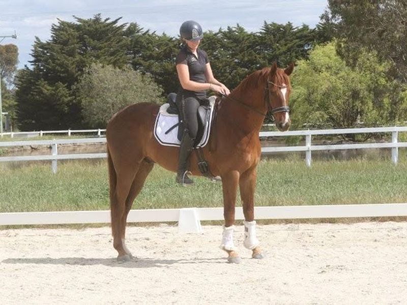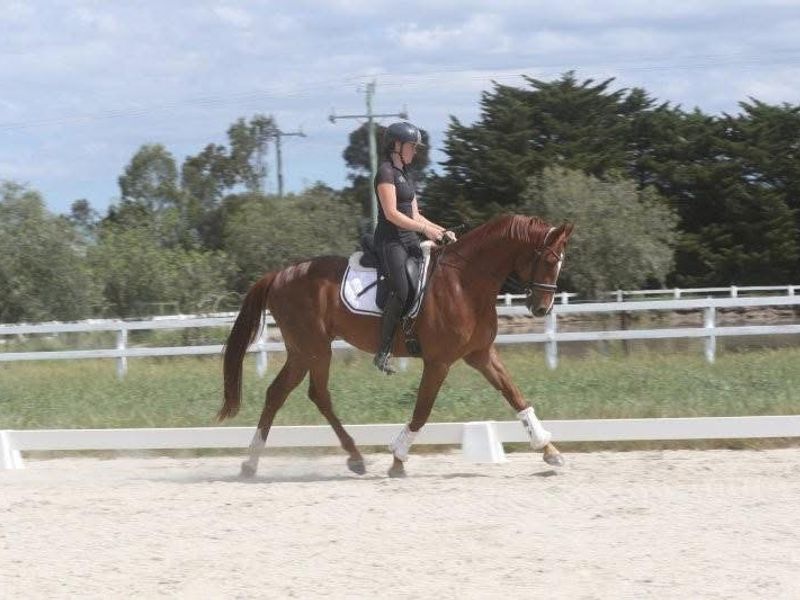 4yo 16.1 1/2hh chestnut warmblood gelding combining the blood of Bellissimo M / Royal Hit / Flaneur. Started under saddle and proving himself to be a trainable, balanced and well behaved young horse who is ready for his next person to continue his training and start his competition career. Bentley is easy to have around, loves people and is in full work at Future Farms. He does have a small ocd chip in right hock - xray and vet report available and it doesn’t affect him. Priced $13,200 inc gst . PM or call Kate on 0412304500 for more information