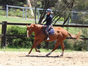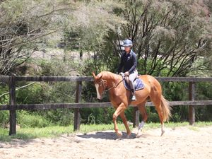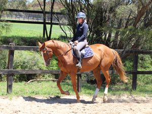 He is a young thoroughbred so not suited for novices/beginners/children.