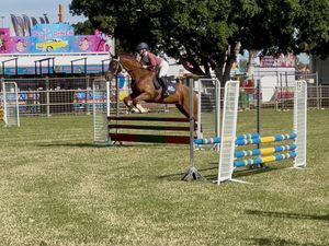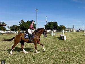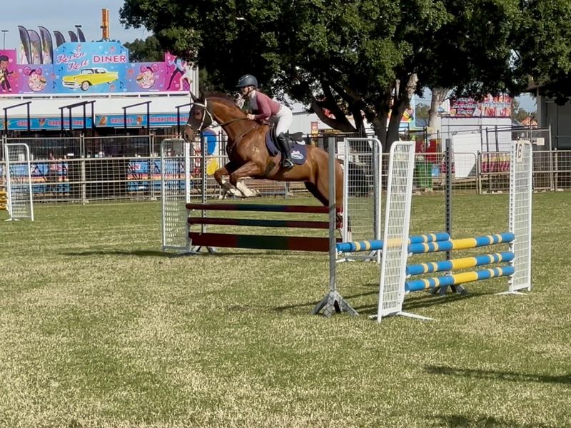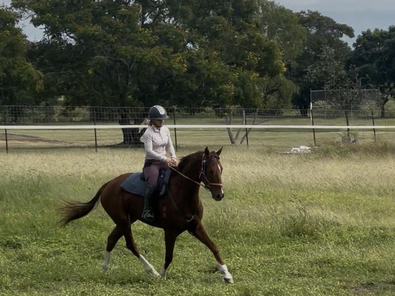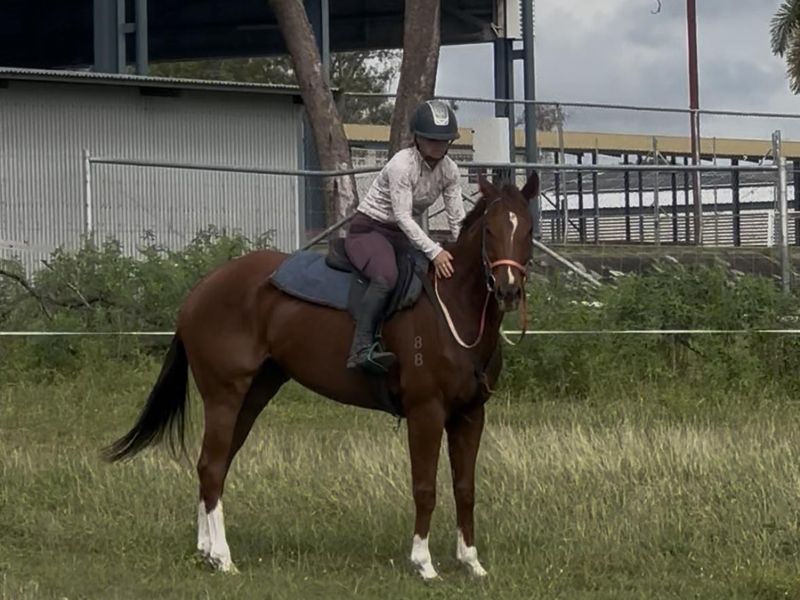 8yo gelding basic flatwork. Finished racing early this year. He has 3 show under his belt. Very willing to learn and hold himself into Frame really nice. Which I think will make him a great all rounder. Very brave doesn't mind fill or brick walls. easy to get on and off ( as I'm very short and need a rail or block )