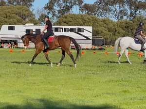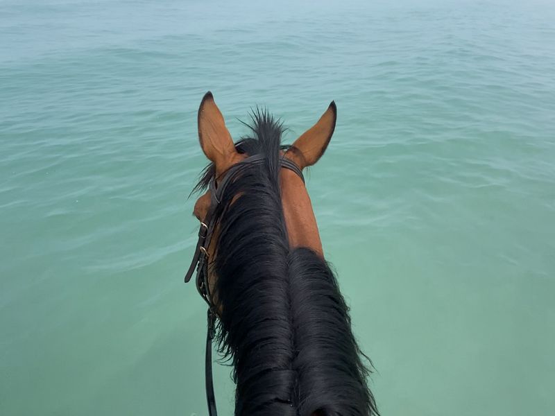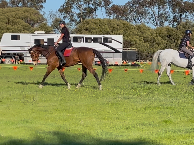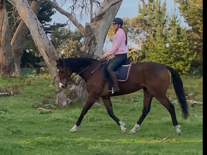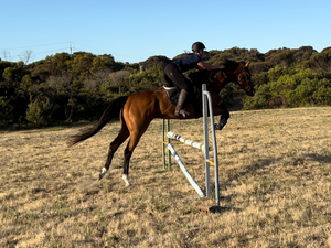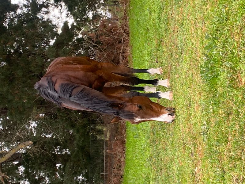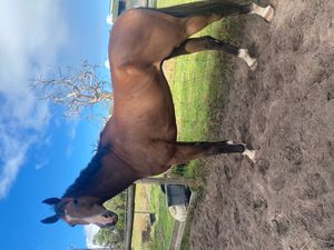 Bronski is a 17.2–3hh, 12-year-old bay OTTB gelding with a stripe and four white socks. He has big, flowy movement and draws attention wherever he goes, making him a lovely prospect for a show or dressage home with further development. He has basic flatwork foundation is sound, sane, and easy to bring back into work after time off. Bronski is generally easy-going, however due to his size he is not suitable for a beginner. He has jumped up to 80 cm at home without issue, though has minimal jumping experience. Bronski is a good doer and maintains weight easily. He has a cosmetic scar on a hind leg which does not affect soundness or movement.