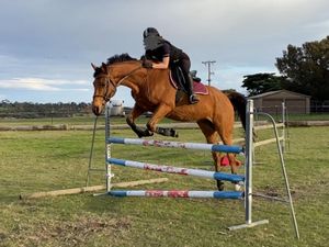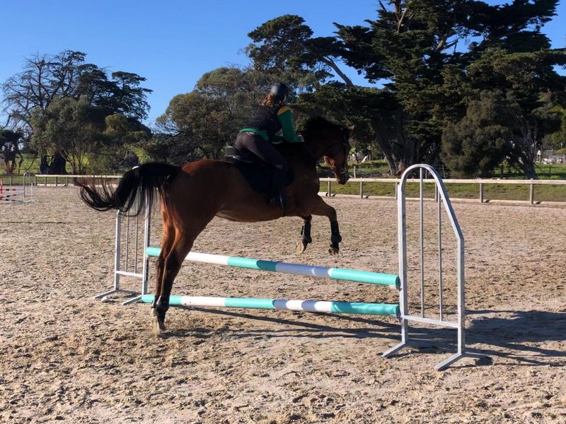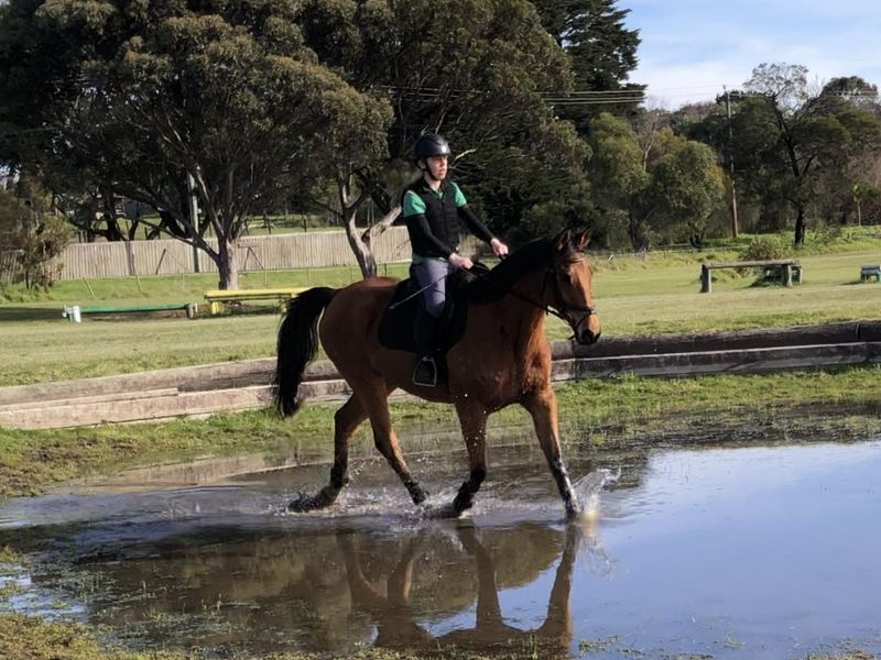 I’ve had this boy for 6 years and he’s a much-loved member of the family. He has a solid education, has attended Pony Club, and absolutely loves to jump – he’ll give anything a go as long as you keep him forward. He has loads of potential as a jumper for someone who wants to put the time in. Overall he’s just a fun guy to ride around -he’s happy to plod around and trot on a long rein but he can go when he needs to!