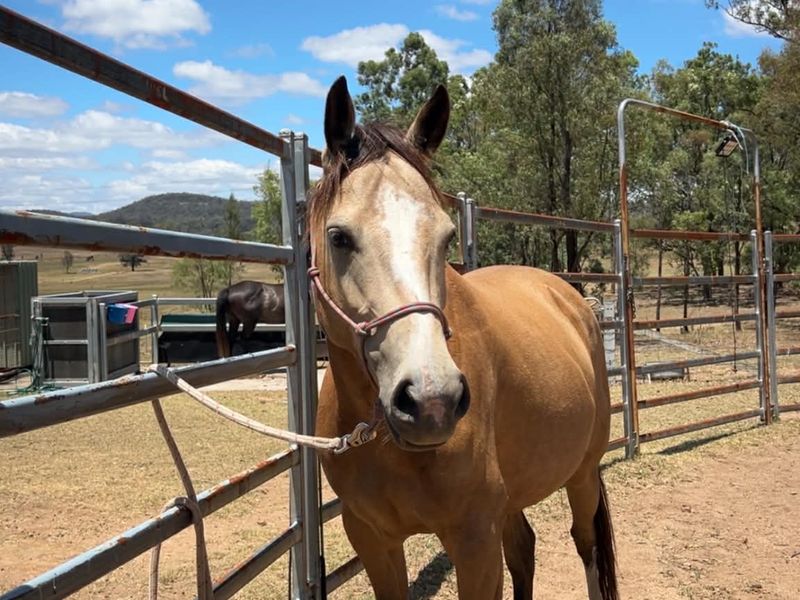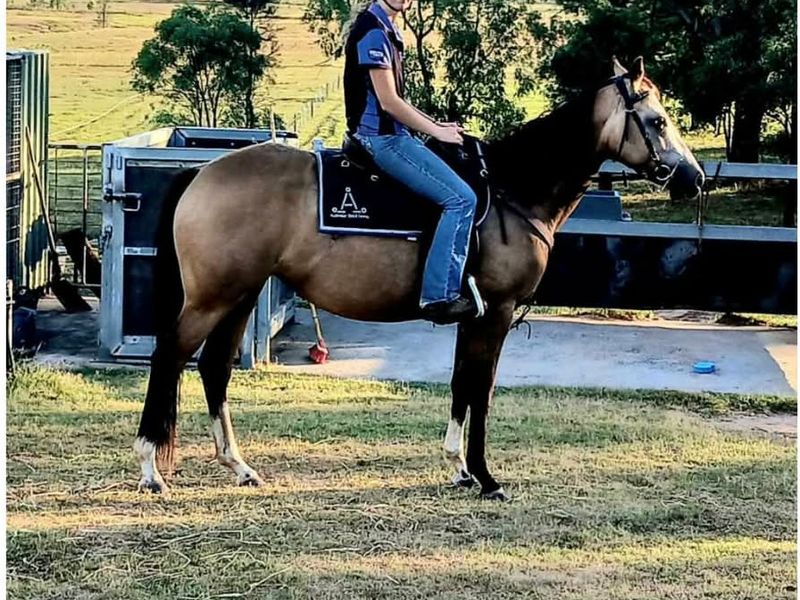 DisciplinesBuckskin mare, 14.2 hh . 4yo. Quarter horse cross stock horse. Broken in going kindly under saddle. Great temperament. Good to handle , farrier, float ect. Would excell in discipline. Quiet .