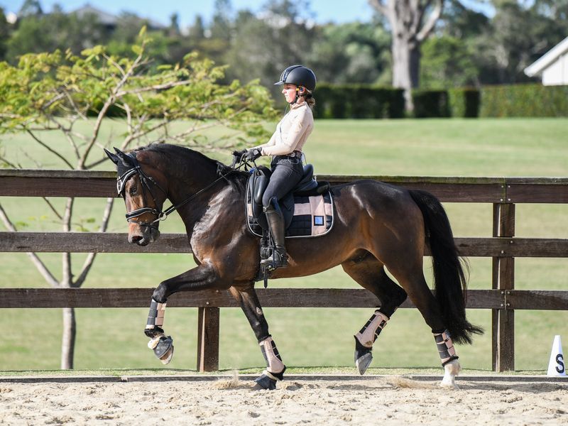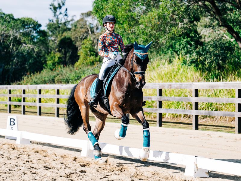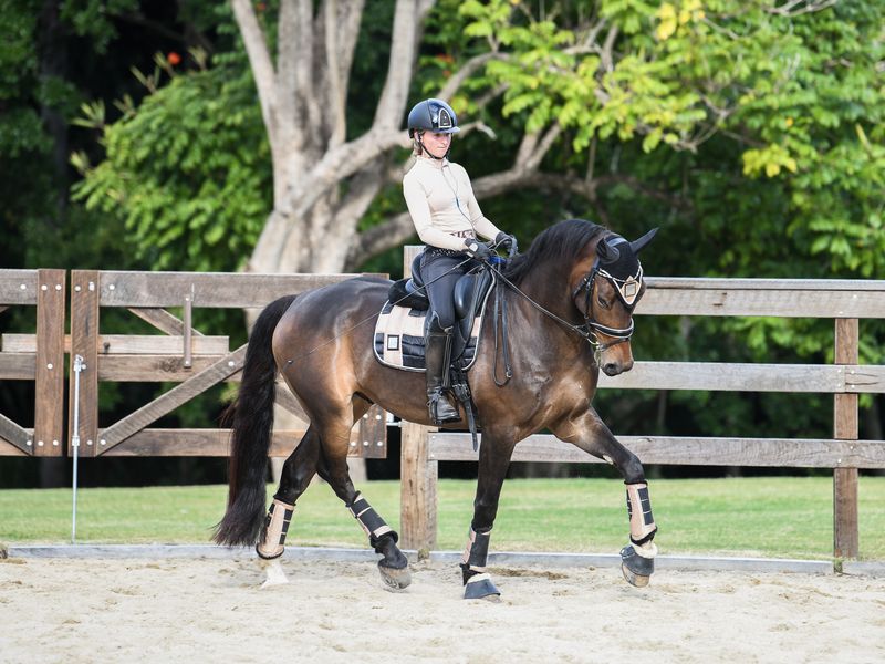 Flying changes are correct and reliable when he is soft, straight, and balanced. If rushed or not properly prepared, they can be hit-or-miss โ nothing dramatic, simply reflects a horse that likes a thoughtful set-up. In regular work, they continue improving fast.