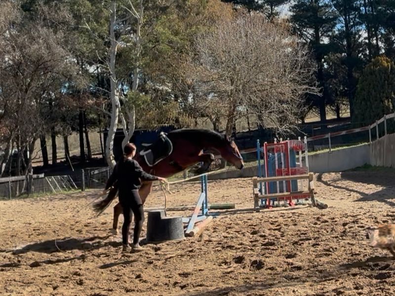 During his first free jumping session he showed impressive scope and confidence, even opting to jump out of the arena with ease—a clear indication of his athletic ability and natural talent.