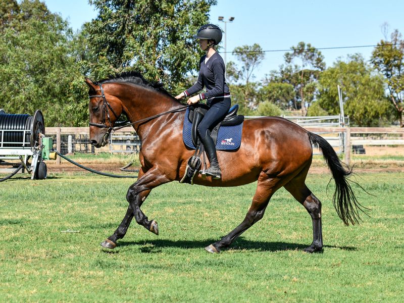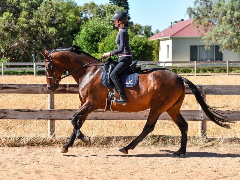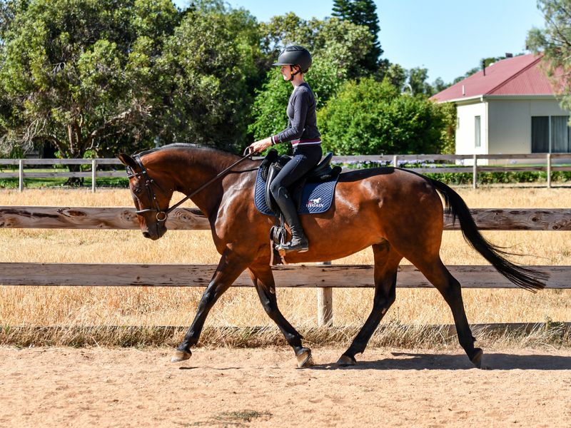 She would suit confident, capable riders from intermediate to adults who would love to do a bit of everything! Adult riding, pony club, interschools, jumping/dressage/eventing, etc. She would not suit a nervous beginner currently or anyone not confident as she has had some quirks in the past--not dangerous or dirty in the slightest!--that have been resolved for over 12 months now. She has not shown any signs of reverting back this prep, she has been super easy and fun and is showing all the right attributes to be a super quiet kids' horse for the future. She is a forward going mare and has slightly more go than woah, (though not hot or fizzy) with a forward walk.