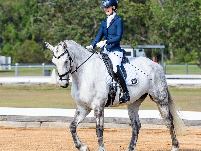 Shari has competed to Elementary and has started flying changes. Trainer believes in her to go to FEI. She is established and confident in her work and loves to be in work.