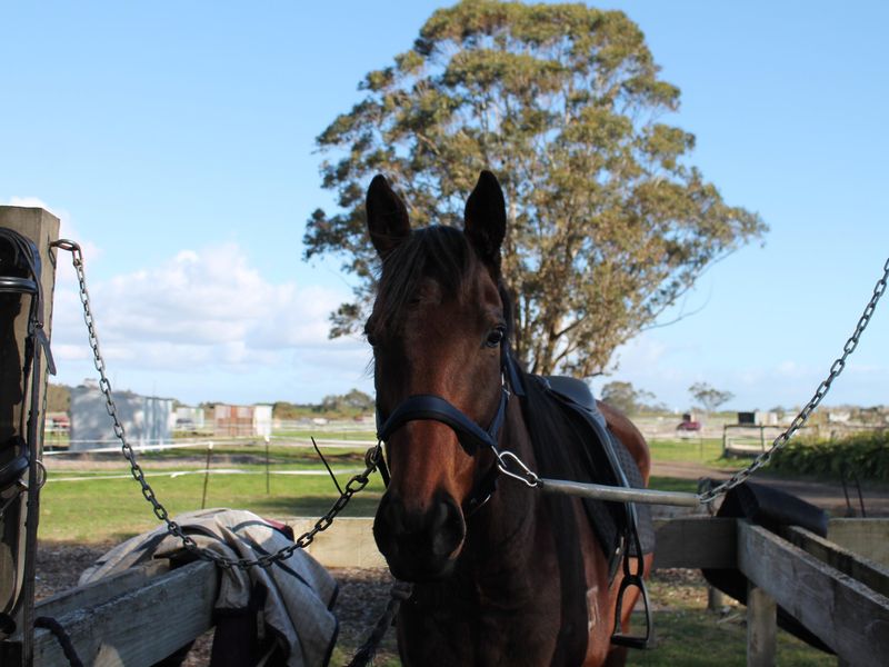 Easy to catch, easy for farrier, can get anxious tied up but just needs a calm, experienced handler. Can be pushy on ground.