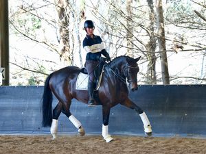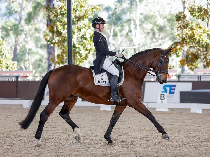 Bred from world-class lines—Danone I x BJK Charisma (by Contango II)—she combines expressive, correct movement with an outstanding temperament. Her powerful hind leg, natural swing through the back, and supple, uphill gaits remain highlights of her work, making her both eye-catching and effective in competition.