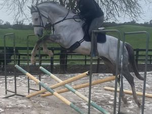 He sits in a nice frame is good off your leg and is schooling nicely , he has just started jumping and is super , careful and scopey he is certainly a powerhouse . He loves jumping and I think his talent lies in this discipline aswell .