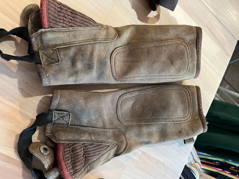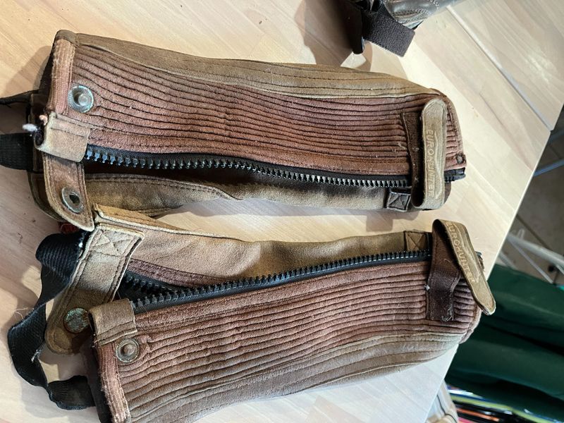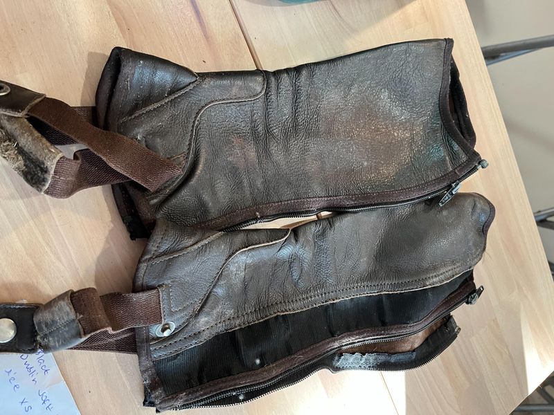 Dublin black soft leather chaps size XS $30 pair Dublin brown soft leather chaps size CM $30 per pair Dublin brown leather chaps size 40cm $30 per pair Eurohunter brown suede chaps size 3XS $20 per pair Brown kids jodphur clips free with any purchase of chaps