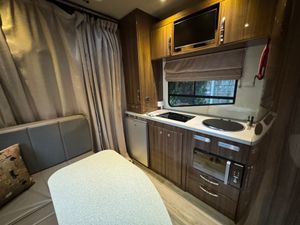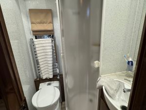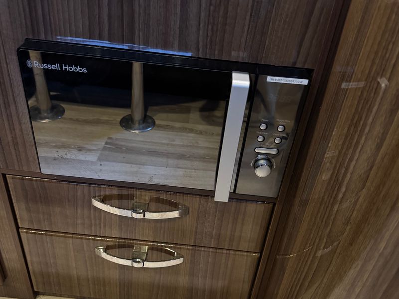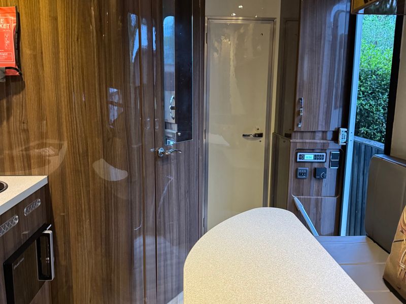 Living area features: beige leather upholstery, sleeping for 4 people (2 in luton peak), (table that folds to a 2nd bed for 2), TV & DVD player, Electric flushing toilet, wash basin, shower and vanity, storage cupboards wardrobe, microwave, diesel cooktop, diesel heating and hot water, 130 litre fridge.