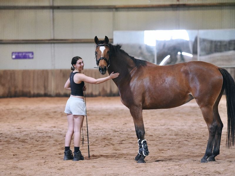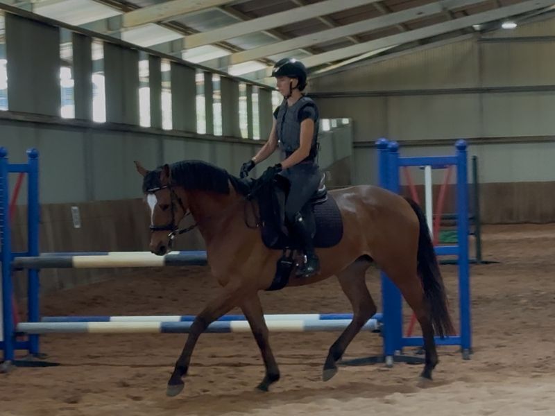 Quinta can be quite cold backed when first warming up, she has never done anything silly and very quickly works out of it (usually a 2 minute lunge will do) She has established basics on the flat and has jumped up to 80cm, showing great potential to easily rise up the ranks!