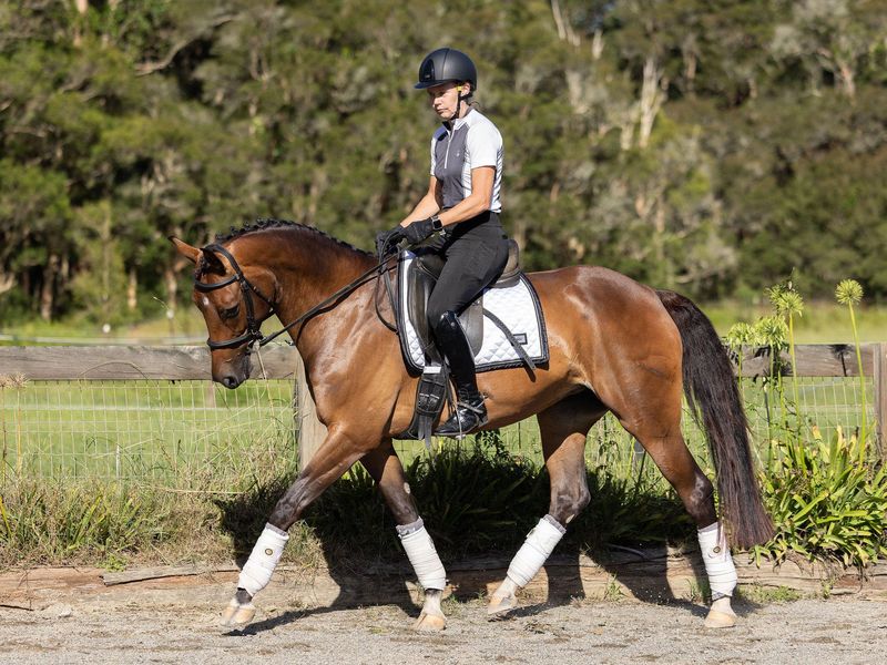 Ready to compete elementary and to rocket up the levels with a capable/ confident rider. Although she has no vices / dirt she can be forward going and sensitive so requires a confident rider, like all young warmbloods she is not for a beginner.