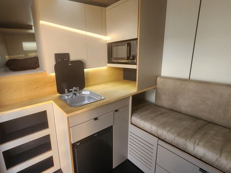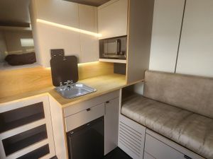 This trailer has full lining & insulation. Is fitted with full Redarc battery management system, with solar and inverter to run 240 volt appliances. Hot water & shower in the horse area. 10 function microwave (includes grill, convection & air fry etc) Queen size sleeping in the Gooseneck area plus additional sleeping on the sofa. 2 x half height wardrobes, pull out pantry & more cupboards & draws for ample storage.