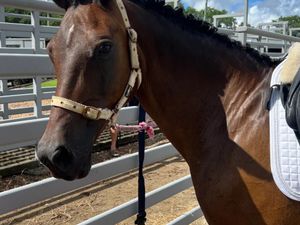 Belle is a super fun, full of character, little pocket rocket. For the last 1.5 years Belle has been training dressage and competing Prelim at members days and currently training Novice at home. She scores consistently mid-60%, with top score of 68% at Caboolture members day earlier this year in prelim.