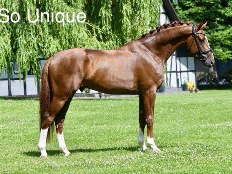 So Unique was awarded premium stallion at the Hanoverian Stallion Licensing in 2017, where he was the auction highight. In 2018, he was again premium stallion at his licensing in Danish Warmblood and later on he won the 35-days performance test in Denmark with the total score of 8,72. He was given 9,0 for the trot, canter, rideability and capacity, and no marks were under 8,5. His impressive appearance, evidently influenced by the great-grandsire, Weltmeyer, and his impressive gaits make him a very special recommendation for future breeding. In 2018 So Unique became Bundeschampionate for three-year-old stallions.