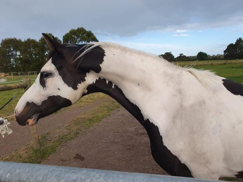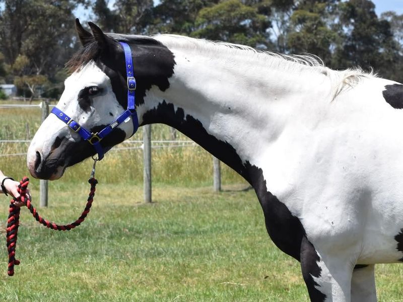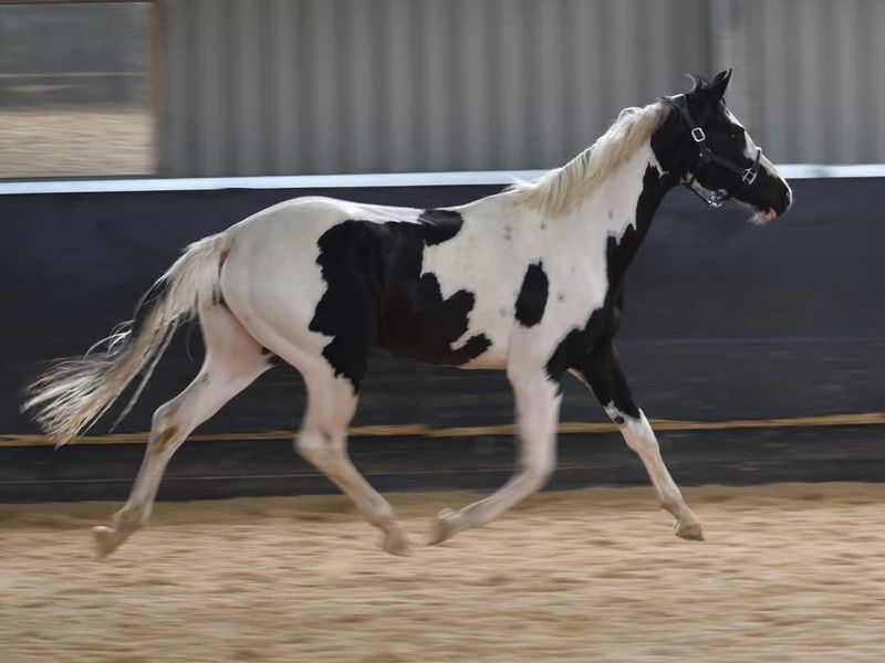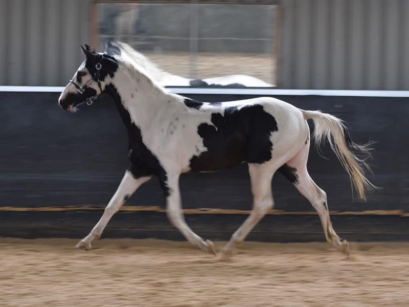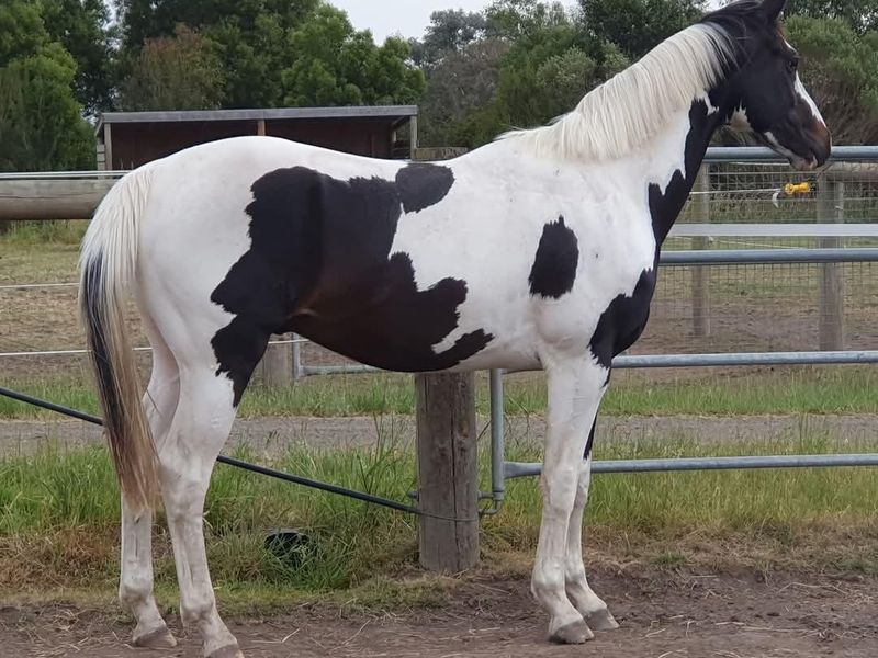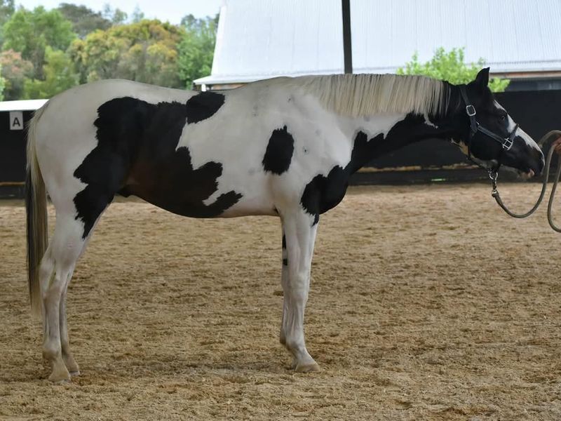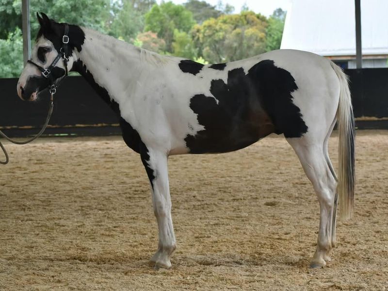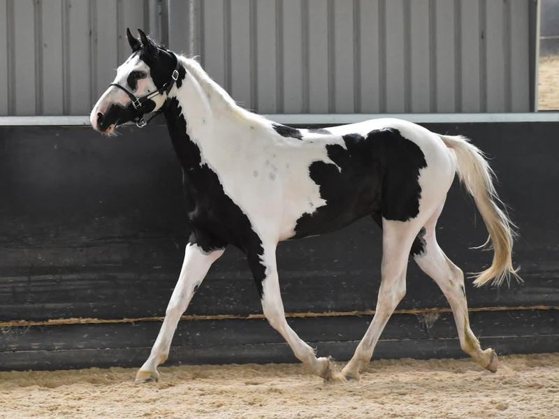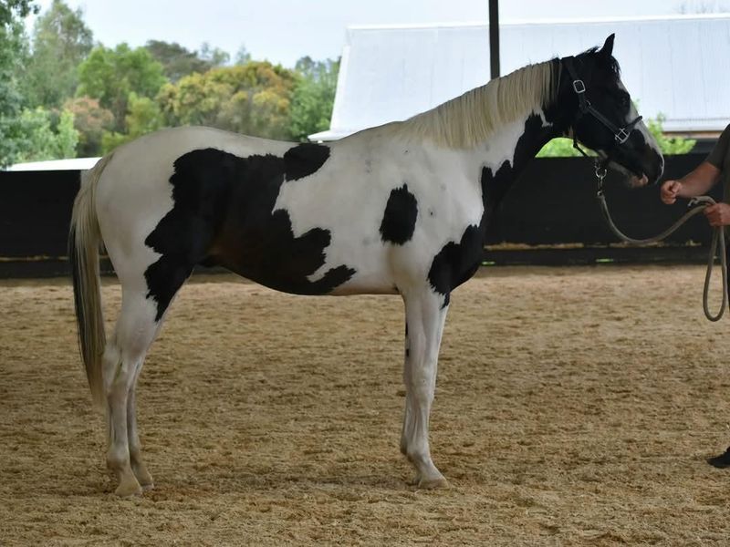 Homozygous tobiano and black, rising 3yo warmblood colt currently approx 16.1hh ACE Registered.