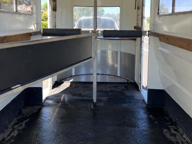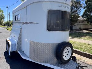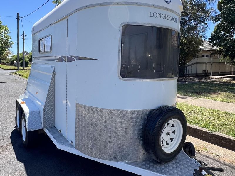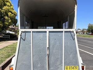 In great condition, new spring loaded tail gate 12 months ago, front floor section replaced 6 months ago. Just had the all the exterior lights re done last month, electric brakes, fold up jockey wheel, Mchitch drop on towing system (pin included), removable stallion head divider, adjustable horse dividers both front and back and has two front doors for easy access. This float has carried two 17hh horses easily. It is a fantastic float to tow and only selling due to upgrade.