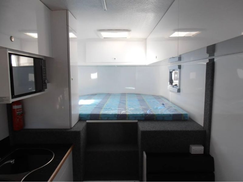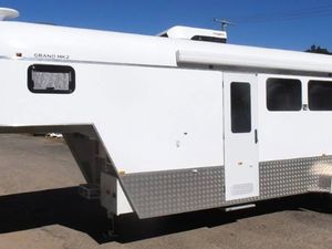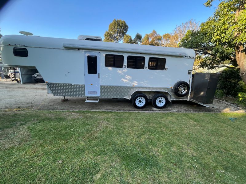 Magnificent KaraKar Grand 3 Horse MK2 Gooseneck Australian Made - top of the range fit out including 12V battery system with Dometic AirCon, Microwave, 12V Fridge, Gas Cooktop, Basin, 12V Hot Water Unit, TV/DVD & Aerial, USB Ports, Battery Charger, Anderson Plugs, Portable Solar Panels, King Bed and Single bed drop down table in living, heaps of storage throughout, large water tanks and external hose connections, individual bay windows, Adjustable telescopic dividers, swing out dividing wall, swing out tack box, hanging robe, rubber kick boards, stainless steel lined horse area, fully lined and insulated roof through horse and living area, 7ft6 internal height, enclosed rug rack, feed bins and takes 3 large WB horses. Beautifully maintained, regularly serviced and in immaculate condition. Only used for competitions.
