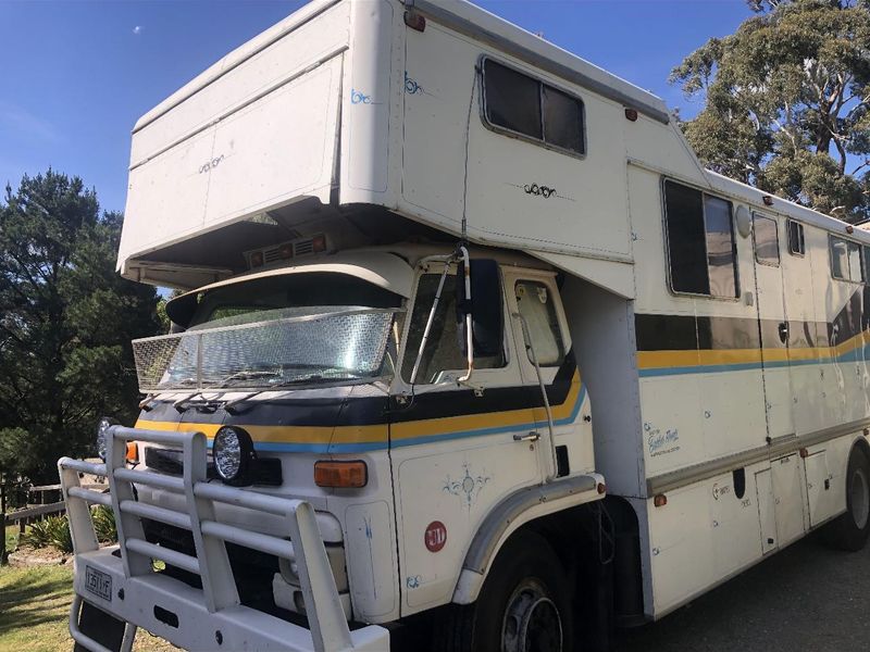 Nissan UD Horse Truck 4 horse Baxter back Living area includes queen bed, shower, cook top, grill, fridge, sink and plenty of storage Regularly serviced and always kept in the shed Crawl through from cabin to living quarters New Tailboard Feb24 Year 1978 but had a new motor 15 years ago and done approx 25,000kms Tare 5350