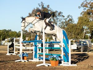 We've competed Cardi actively for the past 2 years that we've had him, he's jumping confidently around 1.20m at the moment with plenty of scope to go higher, we've jumped him a couple of 1.30m classes recently, and he handles them very well. He's very good in and out of the ring, doesn't do anything naughty, will tie happily to the truck all day and he loves to be reassured so that he knows he's doing a good job. Cardi is more whoa then go, his canter as most people have described is like a 'rocking horse', he is soft on the flat and nice in the mouth. Cardi can live by himself, or in a herd environment with no problems and is an easy horse to keep
