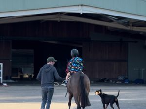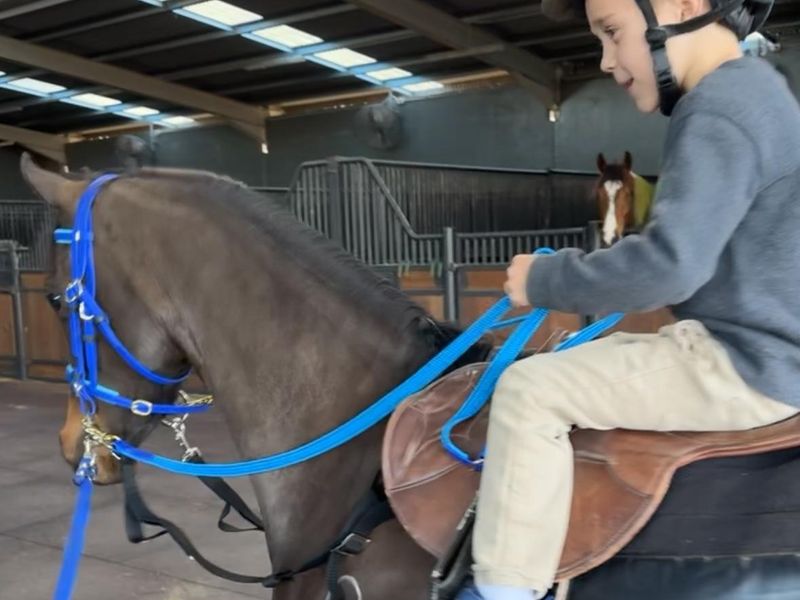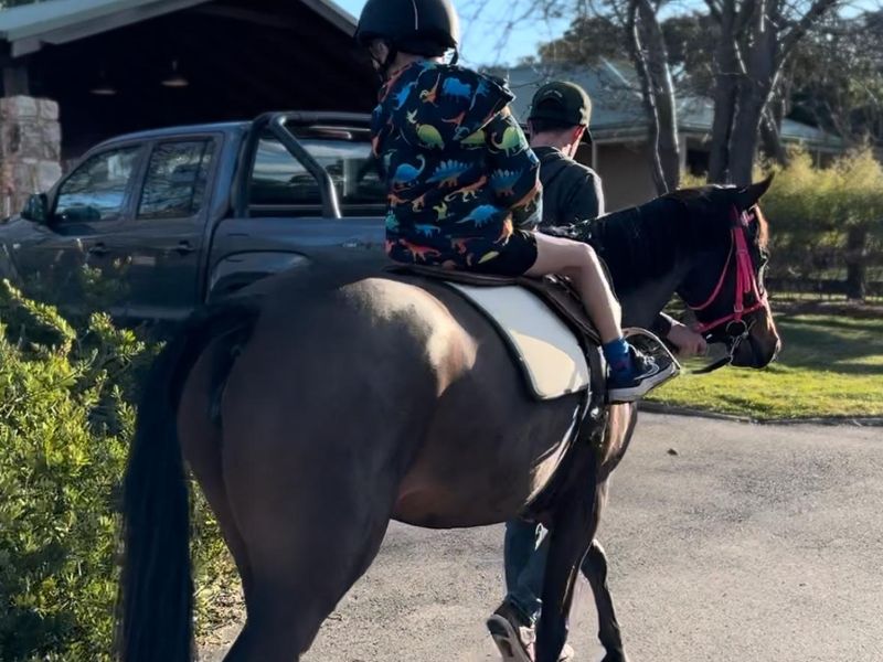 she came to us unbroken, she has since been ridden on the lead/ long reined and lunged on the regular. She is pulled out of the paddock once a week and goes for a farm ride in the lead with my 5yr son.