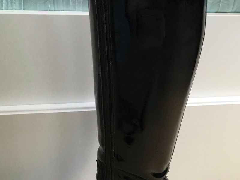 Black patent Konig dressage top boots. Approximately size 9/10 ladies. In excellent show condition. Numbers on inside of boot are 1216 6 2 11 51 41. Calf measures 43cm ,floor to top 52cm , inside height 47cm and sole measures 28 cm. Comes with Konig boot bag.