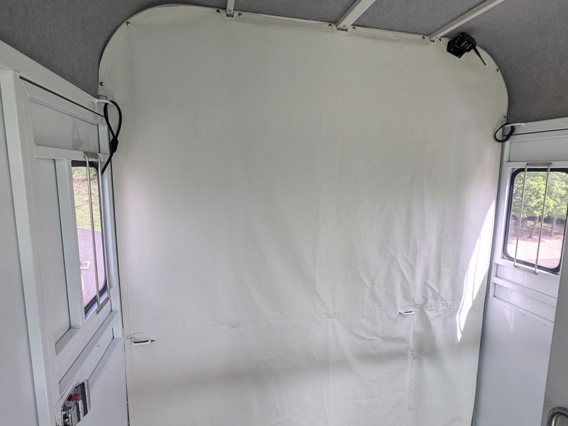 Tackbox in front of float with light, exterior access, saddle rack and bridle hooks and shelving accessible also from inside