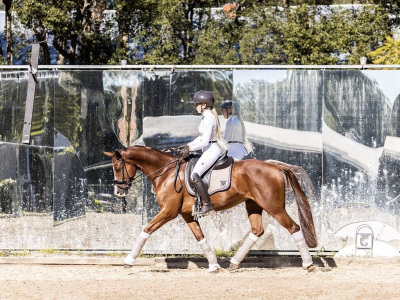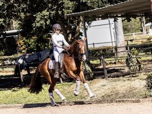 She shows a great ability and work ethic. She is a quick learner and always wants to do the right thing. She has a soft mouth, is forward moving and has 3 lovely, active paces - she has a great hind leg!