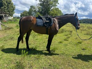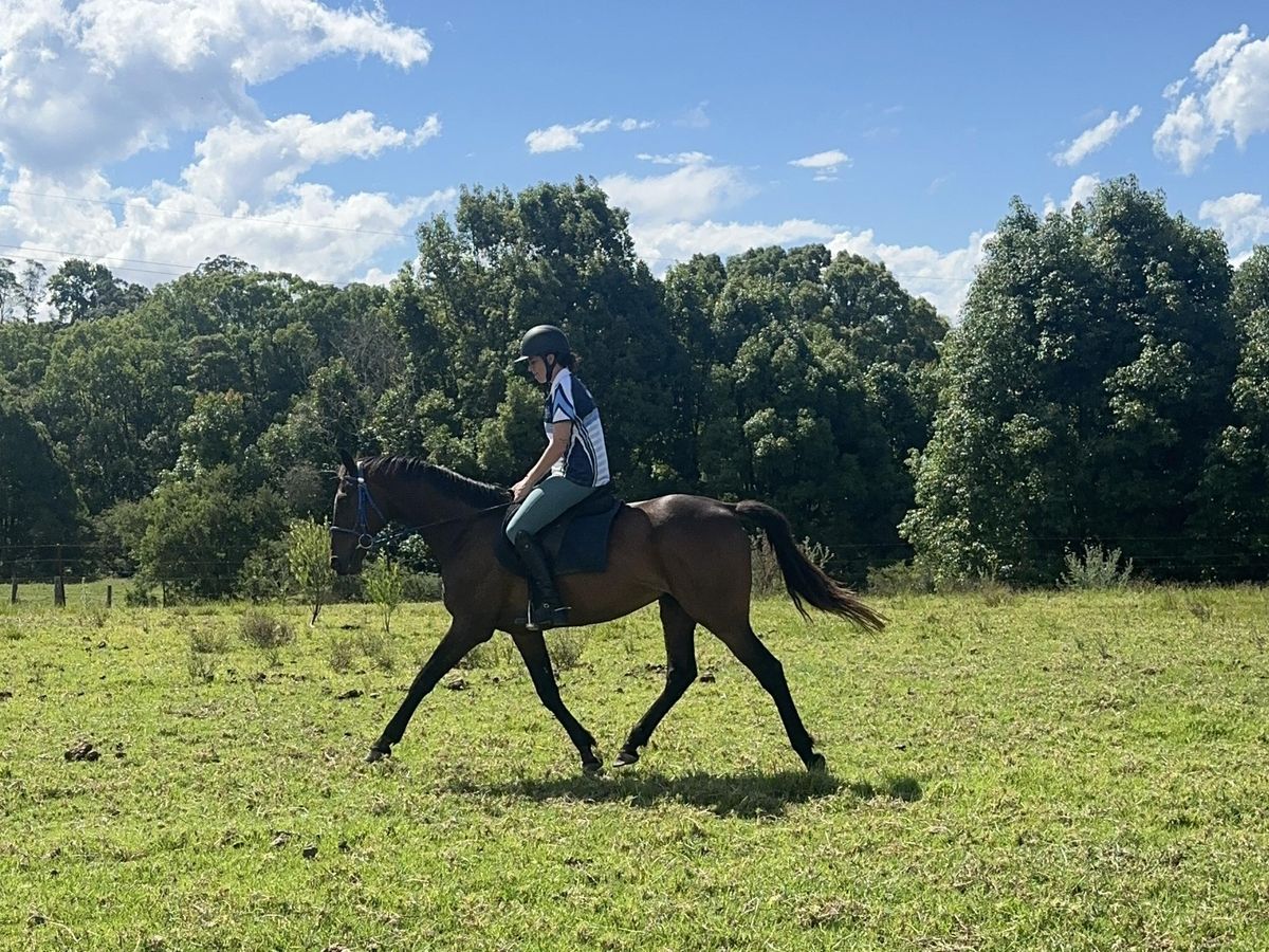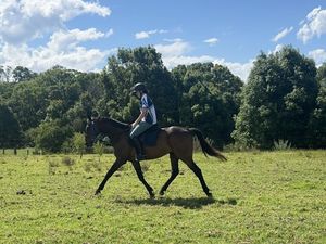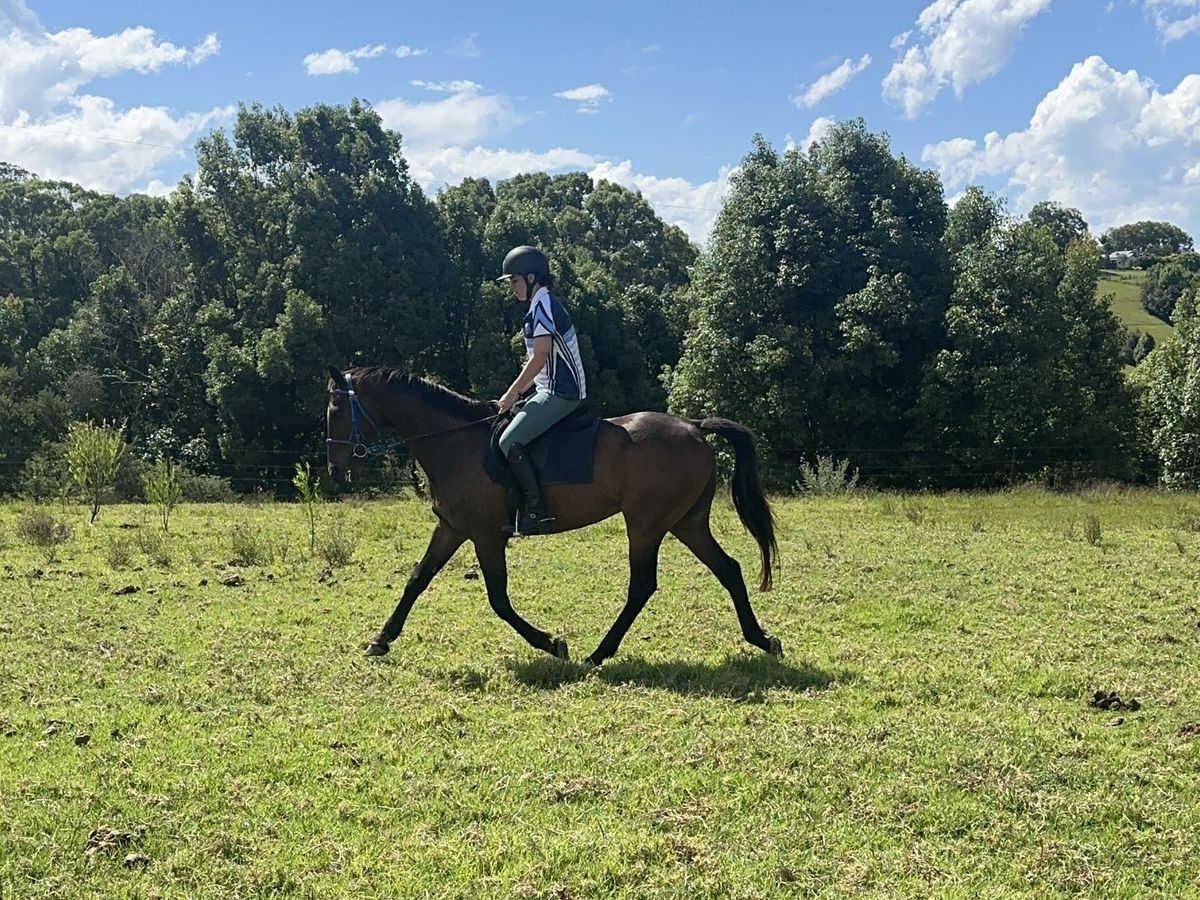 After a prolonged spell he has been brought back in and did not blink an eye - no buck, bolt, rear etc. He is kind and willing, right down to being used as a lead horse for my young kids, and is their best friend to brush and feed. He is ridden in a snaffle and carries himself in a natural frame.