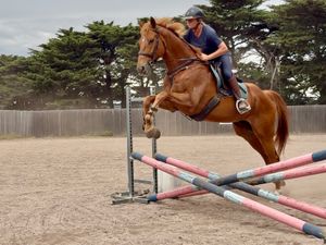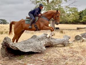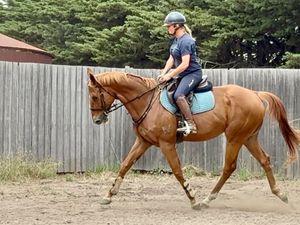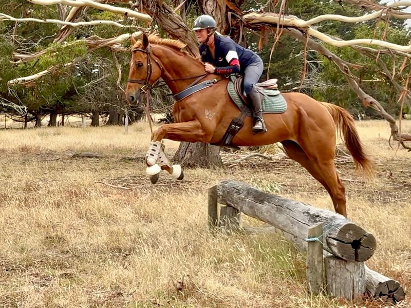 Ralph has started jumping and shows ability athleticism & a terrific attitude and work ethic. He is quiet in the paddock and good with other horses. Lovely to do everything with on the ground, even though he is tall he is VERY manageable. Moves well enough to be competitive in straight dressage, and with a jump like he has could also show jump or event. Just a genuine nice horse. Ralph is one of the very nice thoroughbreds we currently have in for training and assessment. Nice young horse prospect and could excel in any chosen discipline. Good to hack out has been around farm and out on quiet roads.