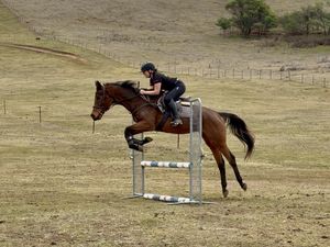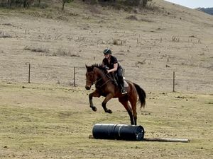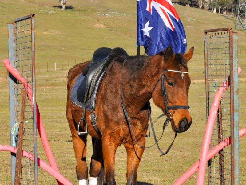While with us Warnie has experienced all sorts of life experiences. He is easy to ride out alone or in company. He will have a go at an obstacle course and not bat an eyelid at anything including walking around with a flag on. He walks straight into water. Warnie has been with us to competitions to walk around and see everything and was completely unfazed and more then ready to compete, just waiting for comps to start back up again.