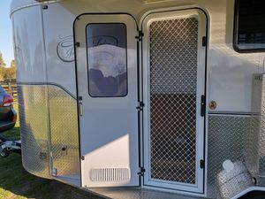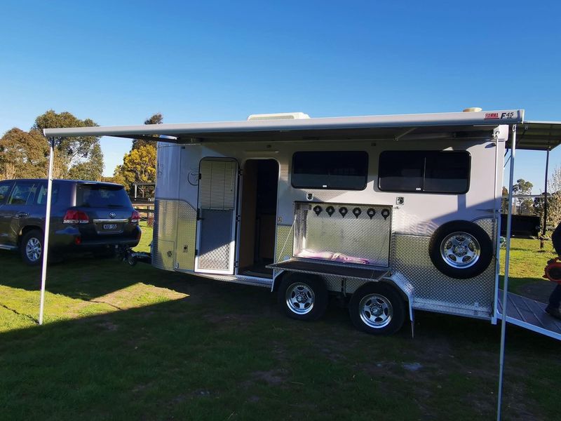 Unique Custom built Float that is stylish and comfortable. Only used a few times since purchased. Always shedded, made for large horses and provision for small. Float height inside is 8', fully padded, all items removable in horse area, plenty of ventilation and insulation in horse and living. Living area has hot and cold water, pull out pantry, plenty of cupboard storage, Reverse cycle AC, TV, Radio, seating for 4, designer fittings, 3 beds, full lighting, gas stove, fridge, caravan door, FL awning, lockable box with bridle hooks and electrical plug, outside water tap to hose or water horses, removable dust cover for tie up area, fly screen at back of float for privacy.