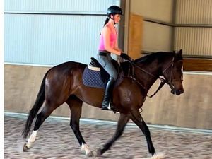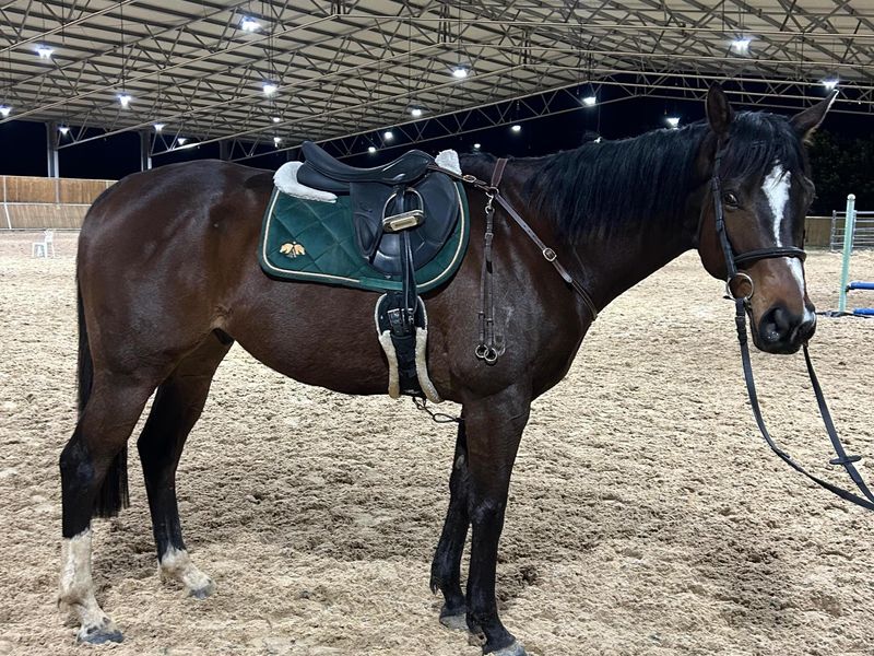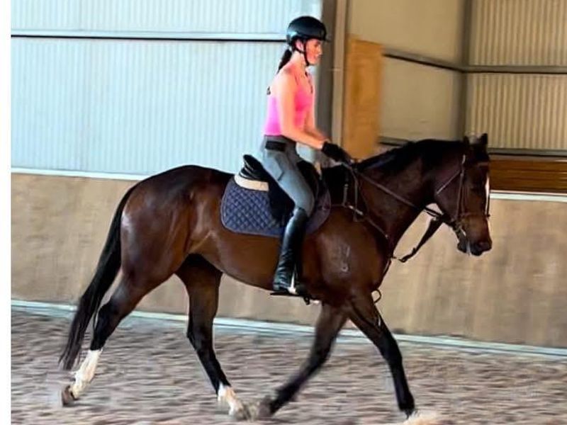 Gambolling is a gorgeous solid boy with lovely paces and a good jump. He has the look at me presence and always gets comments on his good looks. Absolutely no spook, he's happy on trails, in the arena, out at comps and wherever else. a dream to shoe catch float etc. He has been to jump comps, PC and xcountry schooling... ridden mostly by teens since he came off track as a 4yo. u won't get a quieter horse on the ground. To ride he has big movement so not really for a small rider, but there is nothing nasty about him. I had kept a gambo OTT for myself but i just don't have time/inclination to ride atm so no point keeping him. He does windsuck and wears a collar.. thus the lower price than he would otherwise get. This guy is super cool so looking for a good home for him.