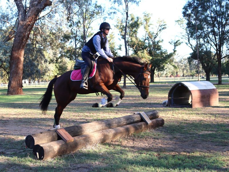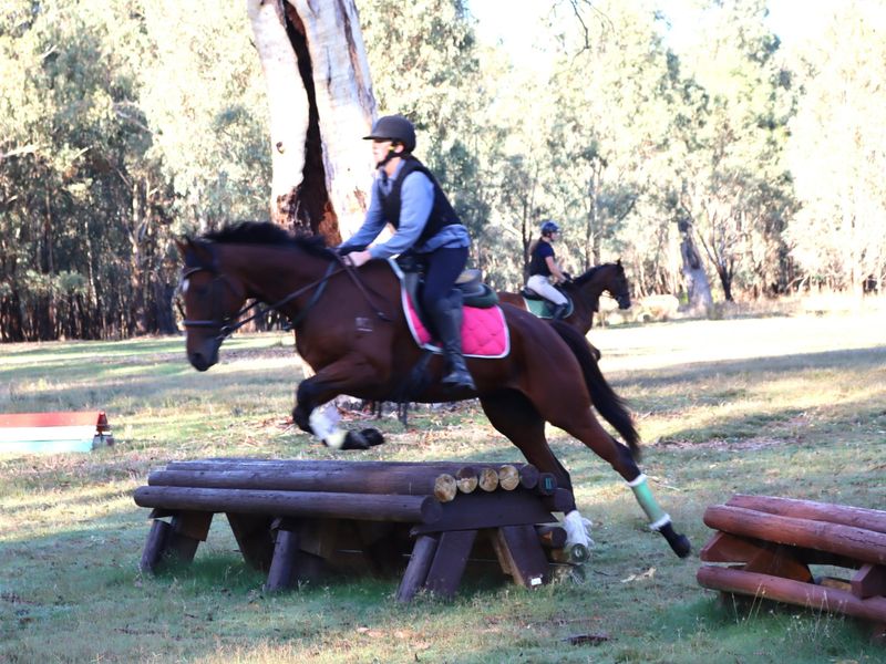 Bold and brave over every fence, we used her to give the other horse a lead when XC schooling, she has no issues (having been trained at home as opposed to in a box at the track, she has been taken out bush and done a few different things before coming to us- Thanks Kate!).