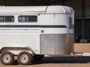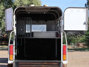 Can include a metal portable tack box which rolls in and sits at the front of the float