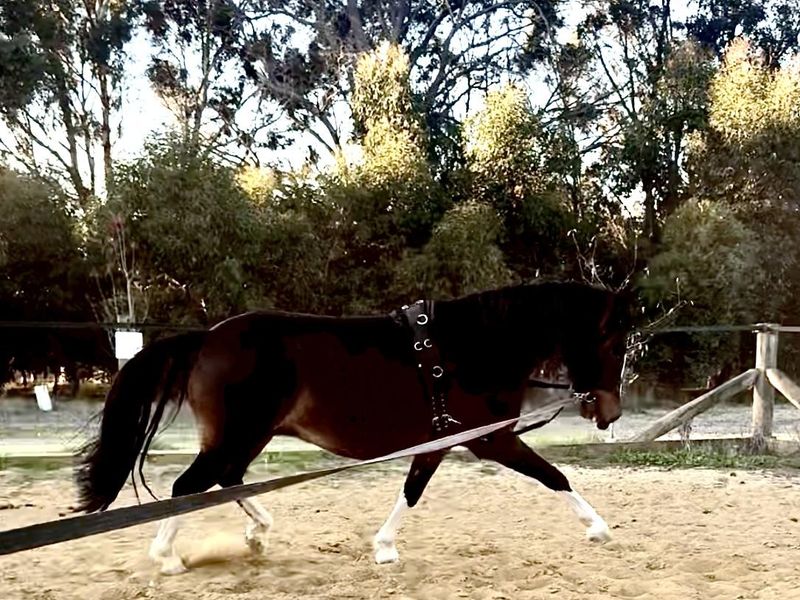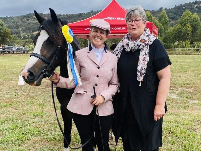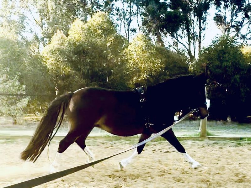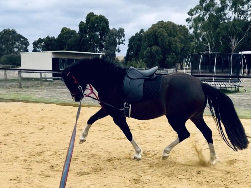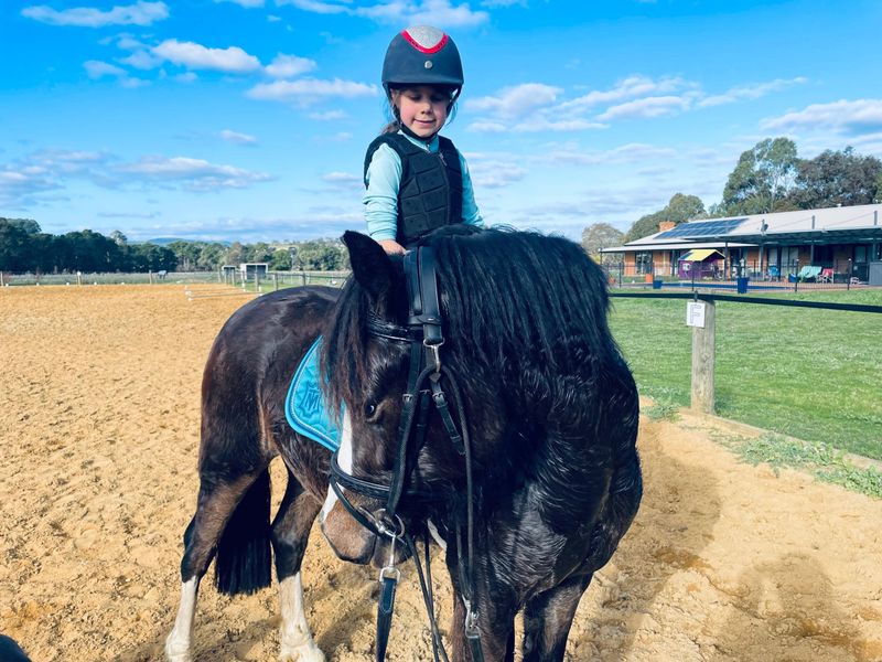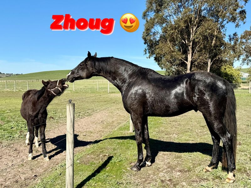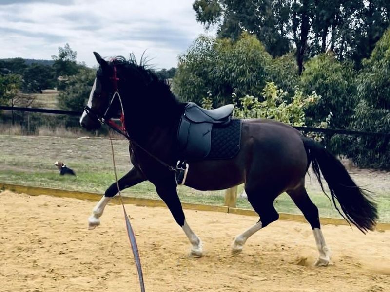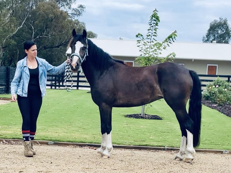 She is gentle, kind, and great around kids, dogs, cats, chooks, motorbikes, pushbikes, excavators and farm equipment. Can be paddocked with others or alone. Perfect to stable and show prep. Great to float, do teeth, farrier, vet, scan, etc. She will catch you in the paddock.