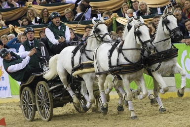 Dobrovitz’ 20-year-old son József Dobrovitz Jr. and Lászlo Kecskeméti were the wild card recipients in Budapest. Dobrovitz Jr., who will compete with a four-in-hand horse and a four-in-hand pony teams next season, drove a new combination of Lipizzaner horses, including a new leader horse. Unfortunately Dobrovitz’s leader horses pulled away just before the bridge, which had to be rebuilt. After that Dobrovitz Jr. lost his concentration and left the arena with 20 penalty seconds finishing in sixth place. Kecskeméti had worked with the four-in-hand owned by Zoltán Korsos for two years. The left leader horse was borrowed from the Hungarian driver Jozsef Scheik, who had received the wild card in Budapest in 2011. Kecskeméti, who had been driving this four-in-hand for two weeks, was unable to put on a good performance in this very strong field and finished seventh.