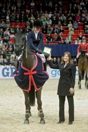 | Sweden's Angelica Augustsson, winner of the 12th leg of the 2010/2011 Rolex FEI World Cup™ Jumping series at Gothenburg, Sweden today is presented with her prize by Magali Dubois Vaucher, Rolex. Photo: Roland Thunholm/FEI Story: Louise Parkes/FEI |