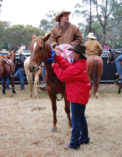 | Emily Tanner presented the blue ribbon and a Horsezone jacket to the winner of the Maiden Draft - Darren Guy, of Gunnedah, riding Oaks Lady |
