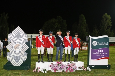 Kurt Gravemeier brought the post-competition press conference to a close with a smile. “The riding was beautiful today. I have to say to the course designer that he built a very good course. The ground was good and I am happy, so now I wait for the champagne!” he said with a laugh. It is indeed looking good for his side, but there is still plenty more action to come before the line-up for the inaugural Furusiyya FEI Nations Cup™ Jumping final is decided.