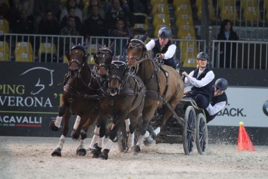 Theo Timmerman received a wild card from the organising committee and proved to be more than worth it. Timmerman lived and worked in Italy for many years and knew the Fieracavalli as a visitor. He set the goal for himself to use the competitions in Hannover and Verona to get his four-in-hand ready for the other four competitions in which he is competing. He knocked two balls of the last two cones in the first round and was very pleased to still qualify for the Winning Round, in which he set a fast time.
