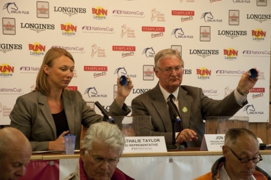 | FEI Commercial Manager Nathalie Taylor (left) and Show Director John Farmer (right) at the draw for the starting order in tomorrow’s seventh leg of the FEI Nations Cup™ 2012 series at Hickstead (GBR). Photo: FEI/Lotte Stevens Story: FEI/Louise Parkes |