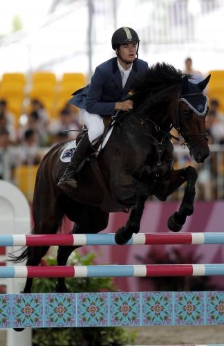 | Tom McDermott competing at the 2010 Singapore Youth Olympic Games on Australian Thoroughbred, Hugo. |